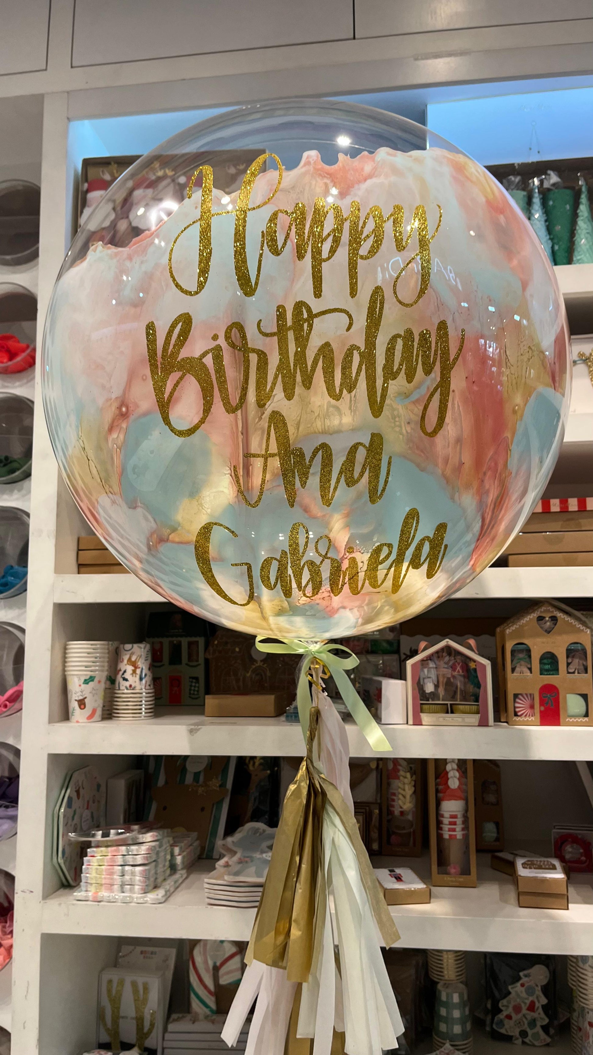 La imagen es sólo un ejemplo del estilo de globo, debido a que tu globo es totalmente personalizado, no quedara como el de la foto.